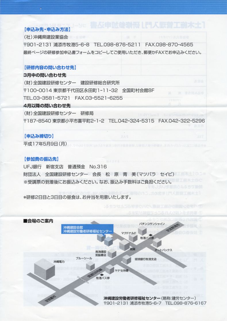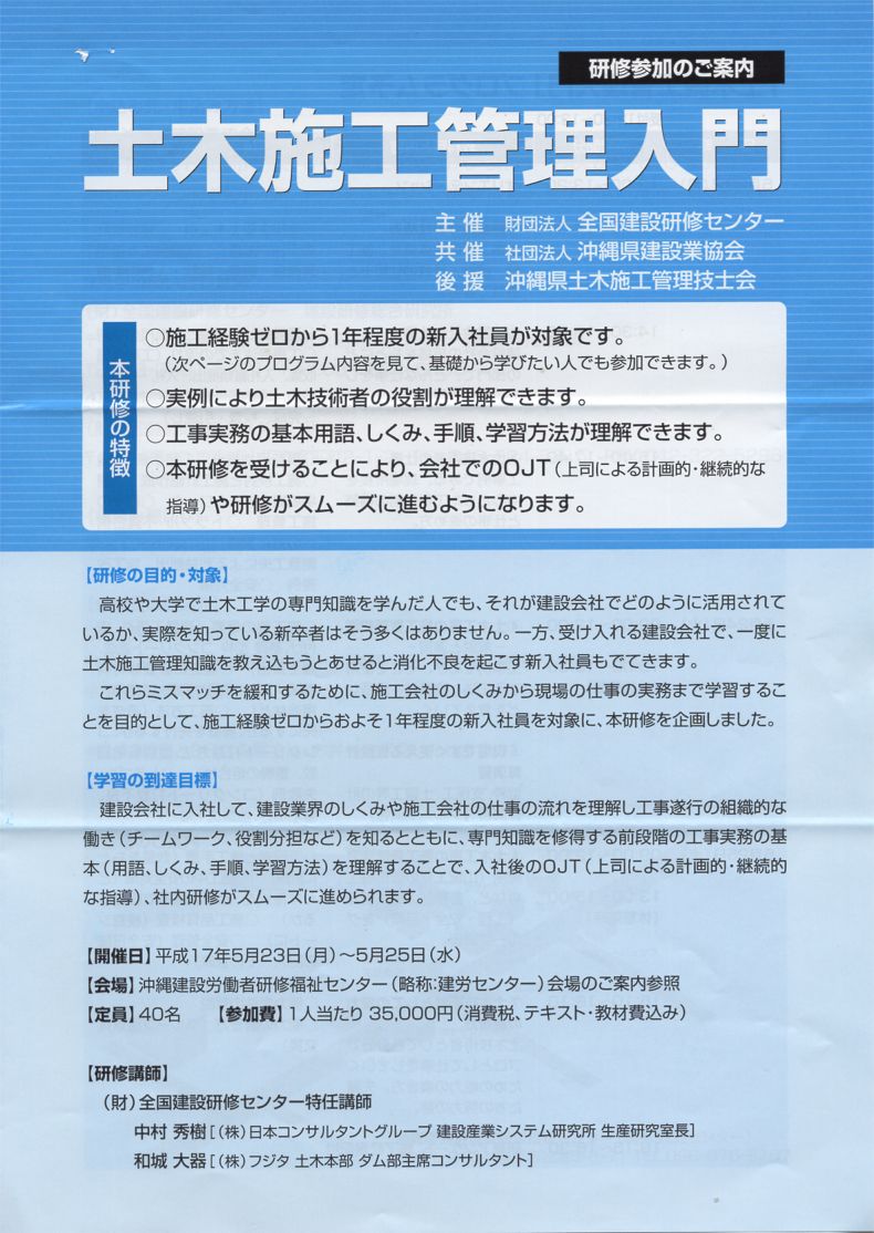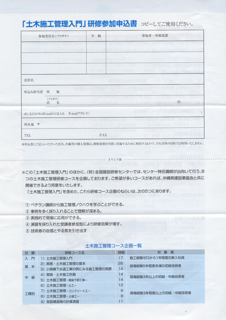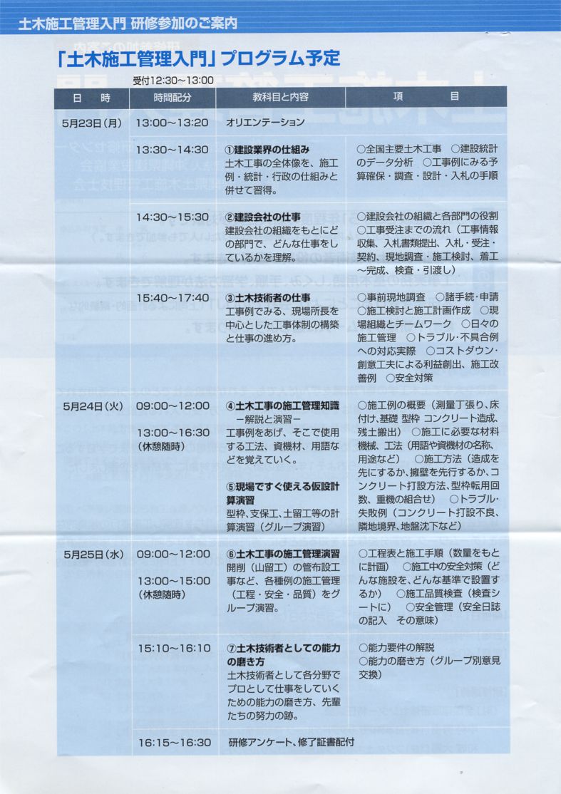さて、本会では(財)全国建設研修センターと提携協力し、施工経験ゼロからおよそ1年程度の新入社員を対象とした標記研修会を開催する事となりました。